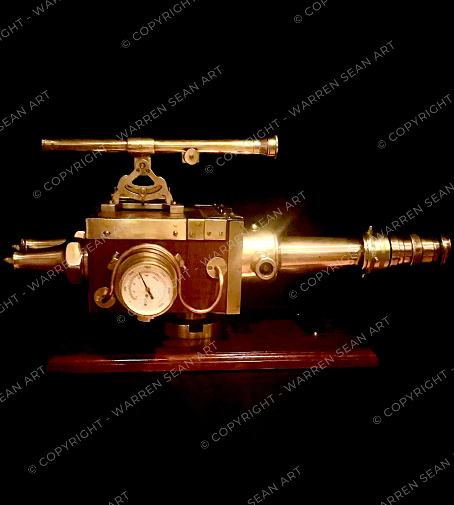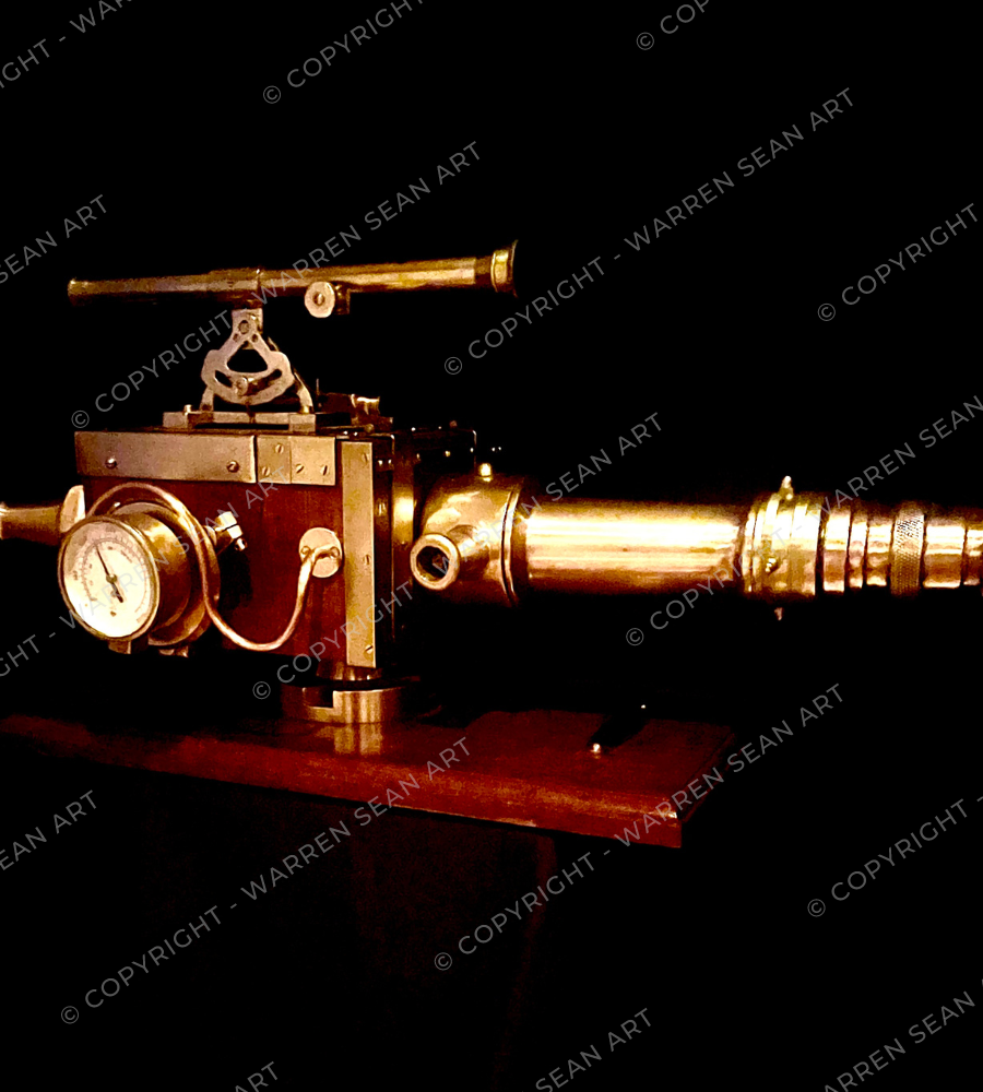 Brass gauge with bevelled glass, brass dumpy level section, brass sighting scope, brass fire hose nozzle sections and pieces, World War 2, wooden and brass field ammeter box, brass World War 2 mounting section, blank 7,62mm bullets, World War 2, brass, British, Vickers machine gun inclinometer, Imbuia hardwood base, various copper and brass items.
