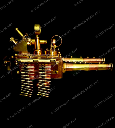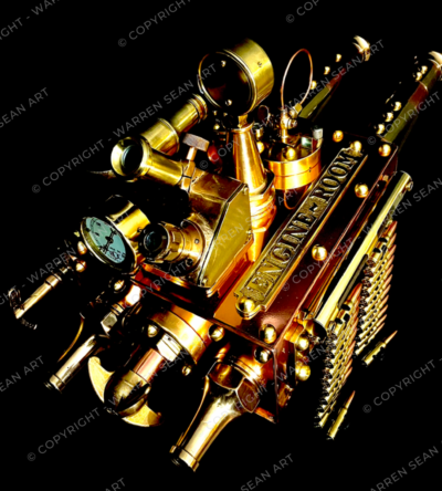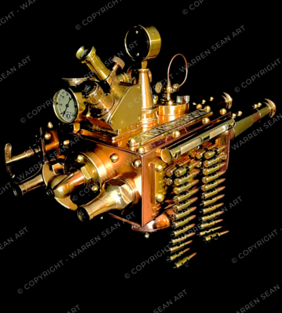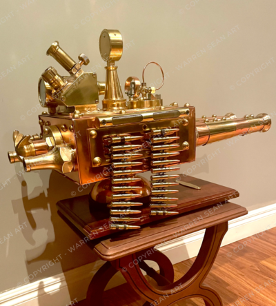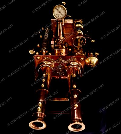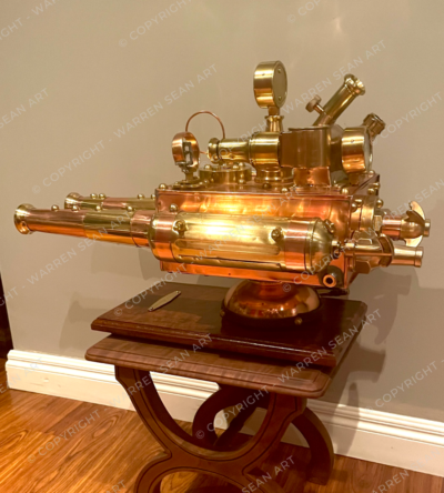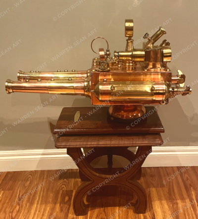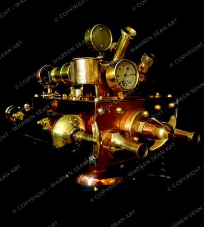 Antique copper housing, brass World War 2 artillery gun sight, antique brass binoculars section, antique brass spirit level section, two vintage copper and brass fire hose nozzles, vintage brass ‘Pyrene’ fire extinguisher, copper bowl, vintage brass blow torch sections and gauges, two brass vintage fire hose nozzle end sections, various other antique or vintage brass and copper pieces on varnished Imbuia hardwood base.