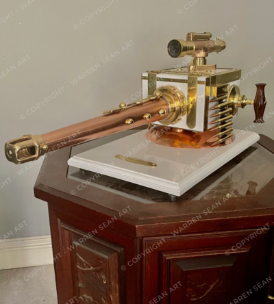 Unusual, long tapered vintage copper fire hose nozzle, brass water pump part, World War 2 field ammeter wooden box with brass, two wooden handles from vintage brass hand air pumps, vintage copper bowl, 7,62mm blank bullets, antique brass dumpy level, World War 2 brass spirit level section, brass boat propeller and various other brass and copper pieces on gloss white painted Imbuia hardwood base.